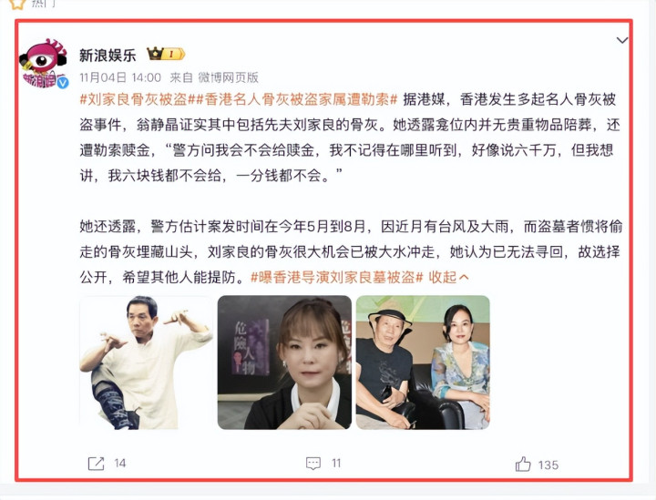 不仅如此,后来还有疑似被盗者联系翁静晶,还发了骨灰盒的照片,并威胁翁静晶不给6000 万港元赎金,就销毁骨灰。