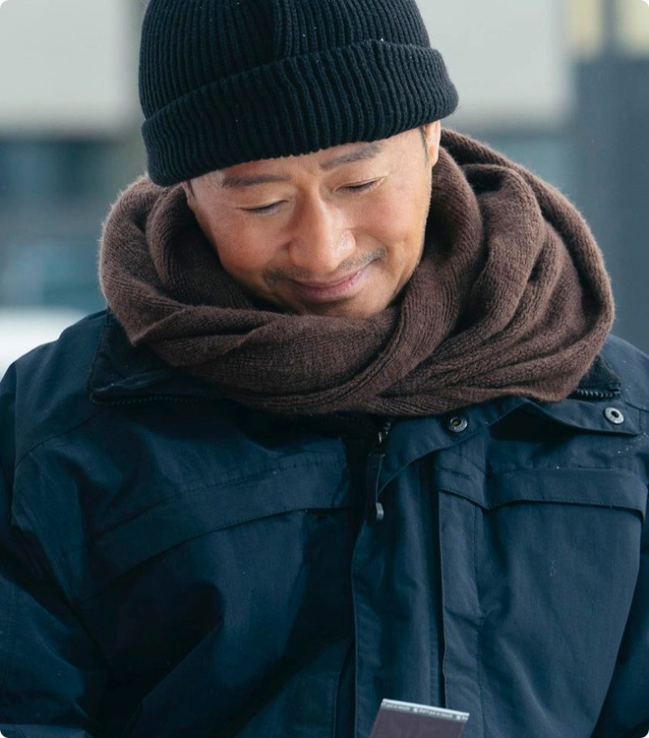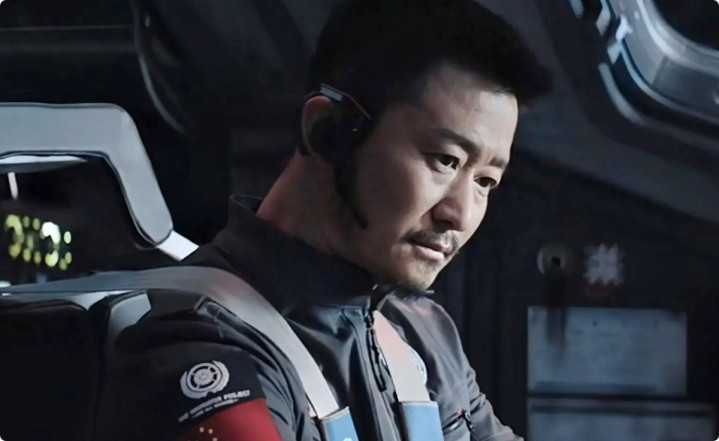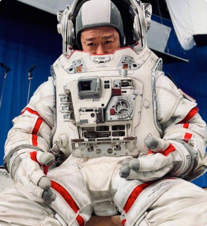 照片里,吴京穿着厚重的宇航服,比起以往银幕上类似民族英雄的挺拔,吴京的表情多了几分疲惫与沉重。
