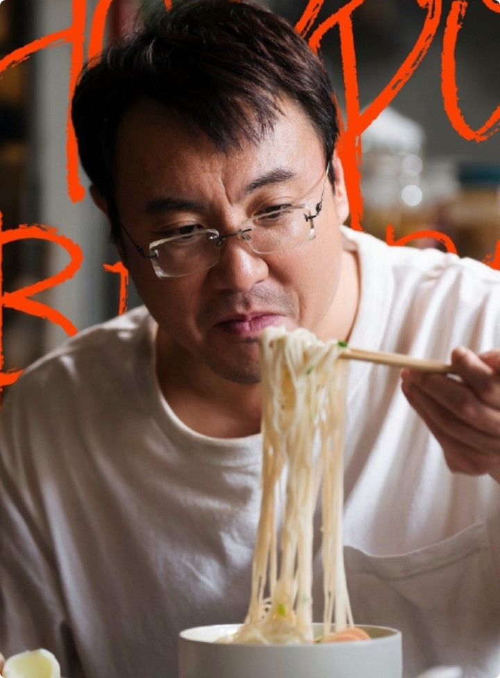 沈腾身穿白色T恤、戴眼镜,一碗面条下肚。