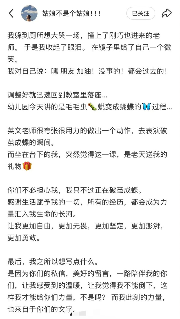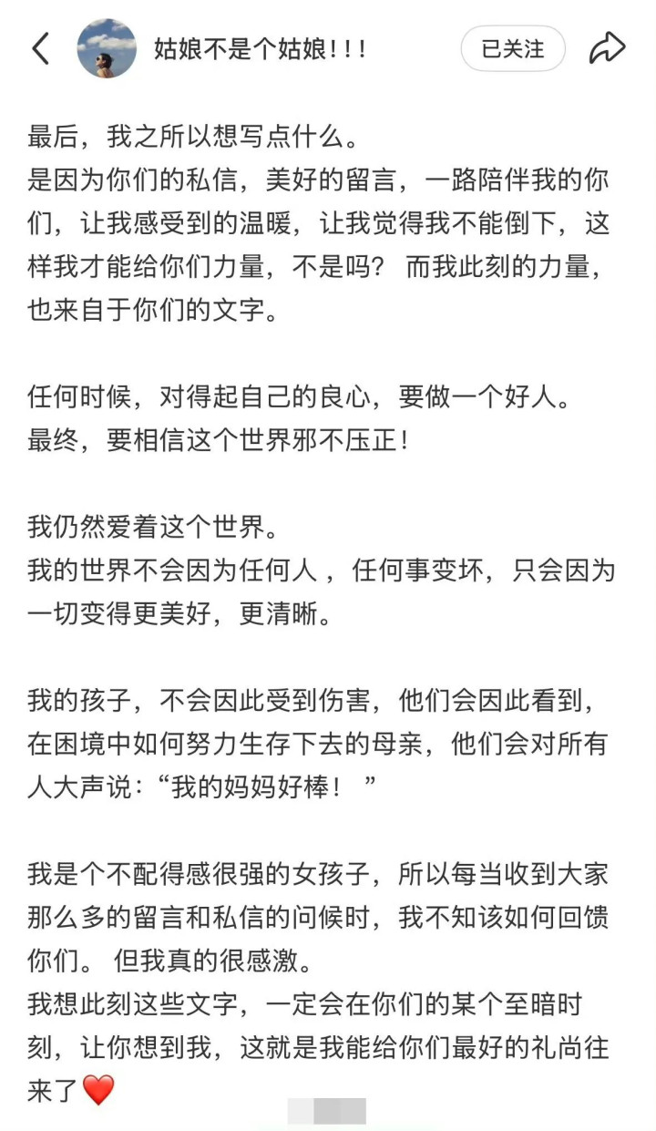 她又表示,正是大家给她的力量,才能让她努力支撑下来,她仍会爱着这个世界,也会努力保护好孩子不受伤害,要做一个努力生存的妈妈。