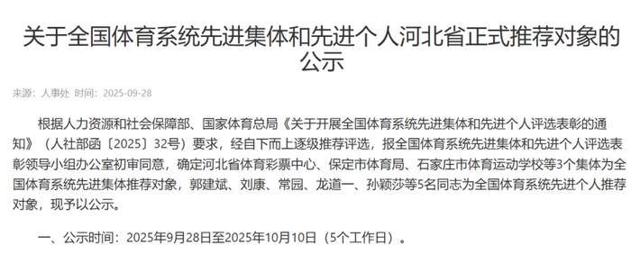 该公示显示:根据人力资源和社会保障部、国家体育总局《关于开展全国体育系统先进集体和先进个人评选表彰的通知》(人社部函〔2025〕32号)要求,经自下而上逐级推荐评选,报全国体育系统先进集体和先进个人评选表彰领导小组办公室初审同意,确定河北省体育彩票中心、保定市体育局、石家庄市体育运动学校等3个集体为全国体育系统先进集体推荐对象,郭建斌、刘康、常园、龙道一、孙颖莎等5名同志为全国体育系统先进个人推荐对象,现予以公示。